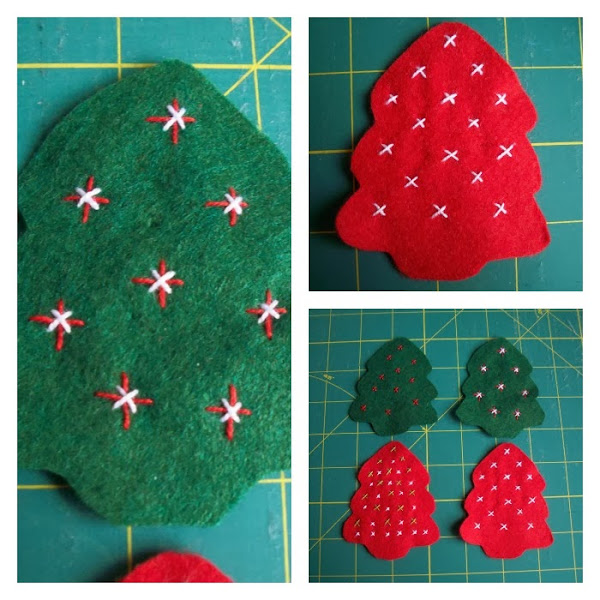 Ahora vamos a decorar nuestro adorno. Y aquí podemos dejar volar nuestra imaginación. He utilizado unos colores que destaquen sobre el fieltro, y he bordado unas estrellas, en algunos casos estrellas dobles, pero también se pueden utilizar abalorios, lentejuelas...