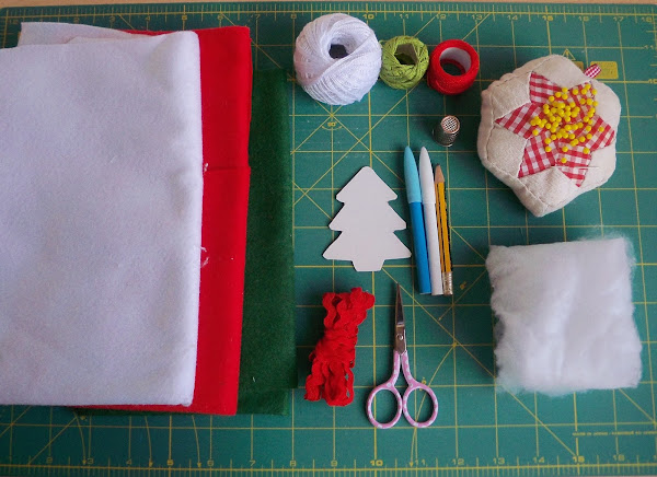 Estos son los materiales que vamos a necesitar: fieltro en los colores que queramos, hiló de perlé en colores variados, agujas y alfileres, un poco de relleno, tijeras, cinta decorativa, patrón y lápices para marcar.
