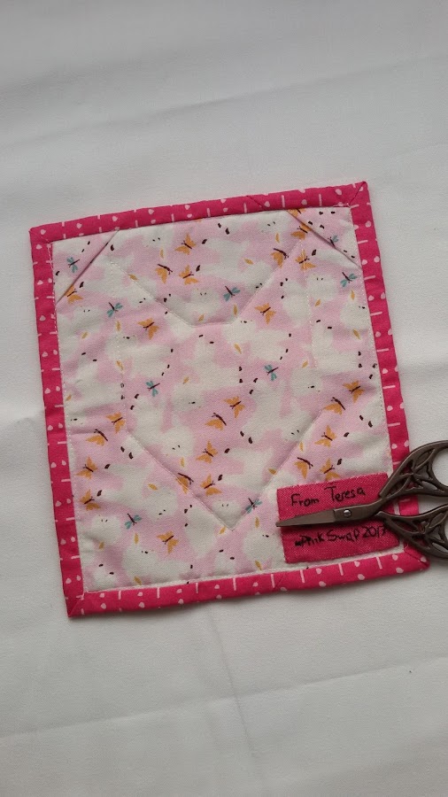 A finales de año me apunté a un intercambio en Instagram, #pinkswap2017. No soy mucho de rosas ni de San Valentín pero al ver las opciones que había para enviar estaba la opción de un mini mini quilt y como extras sólo había que enviar una postal de la ciudad, así que me animé.