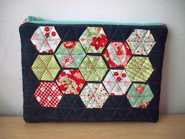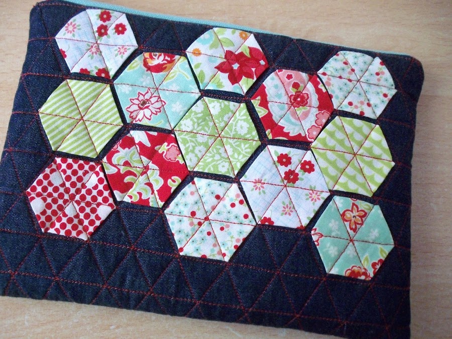 Y como tenía hechos unos hexágonos de unas telas de Bonnie&Camille, los combiné con una tela vaquera. Los hexágonos miden de lado 2cm.