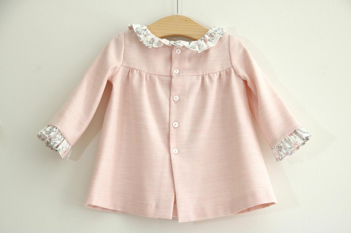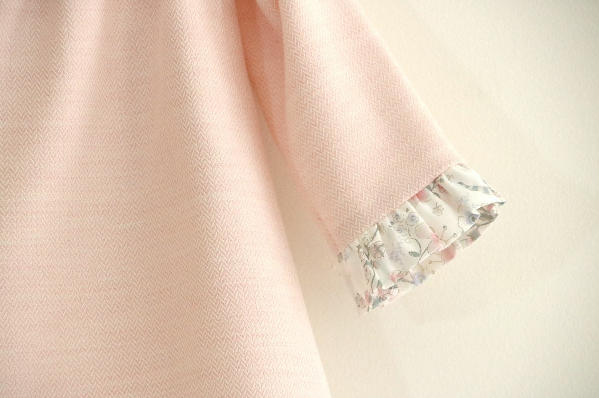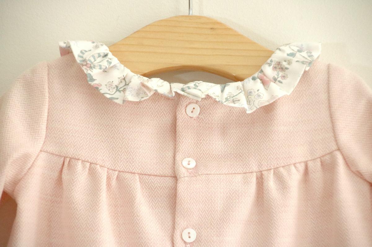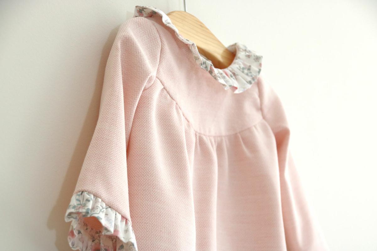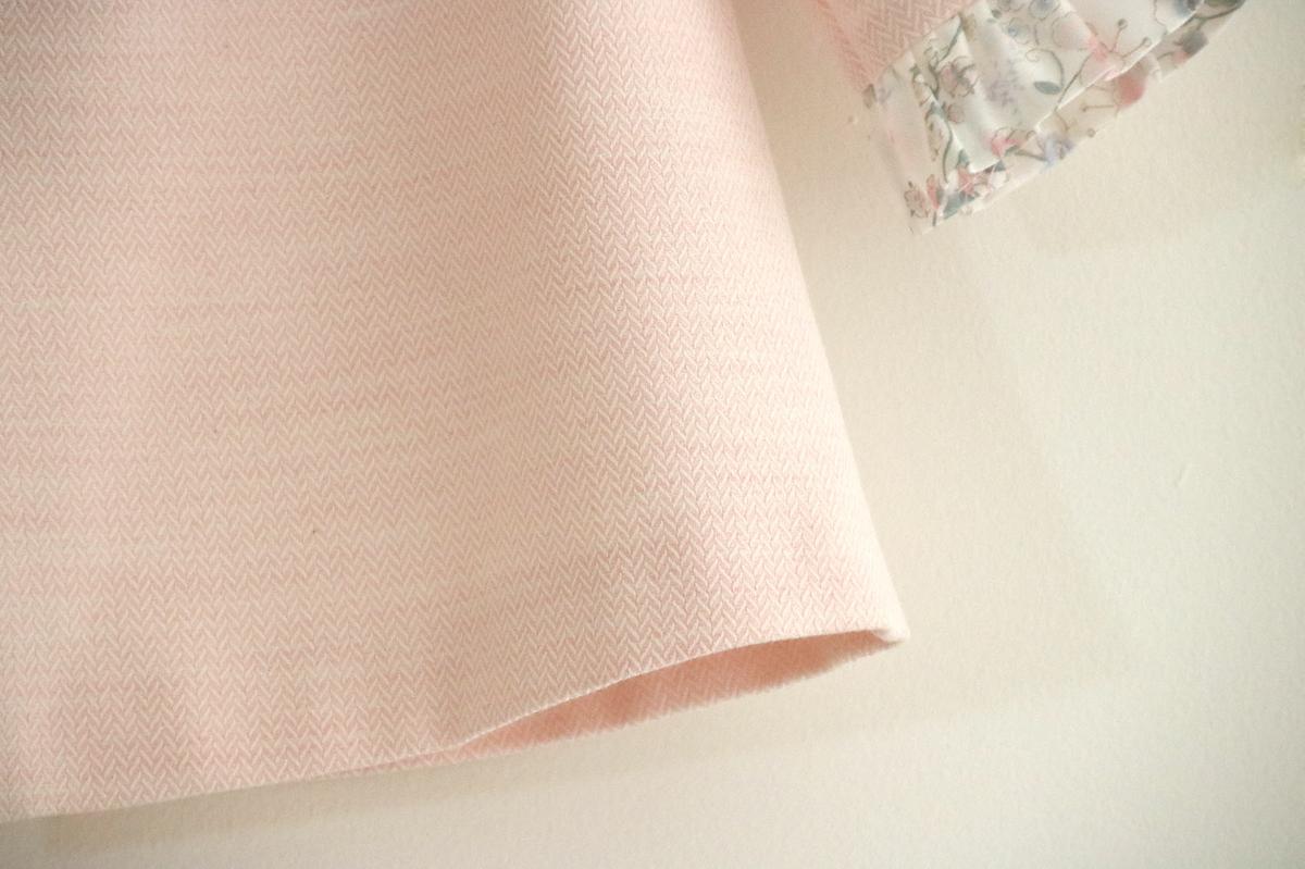 La tela principal que he utilizado para este vestido es una franela de espiga color rosa. Para la confección del detalle de cuello y puños elegí una viyela estampada de flores rosas