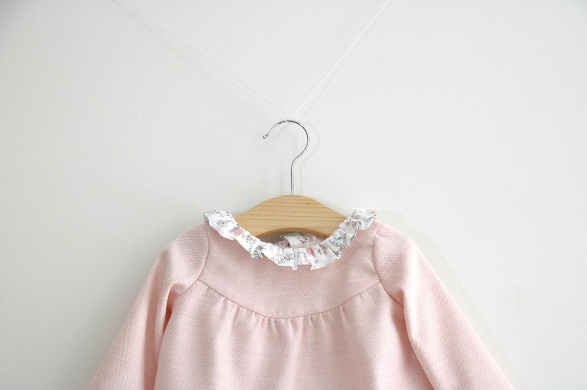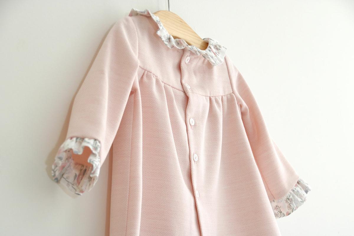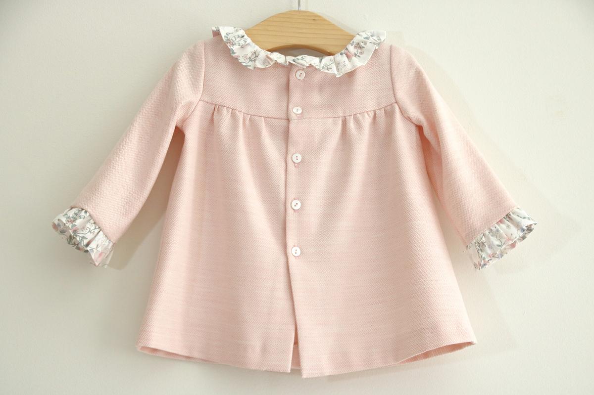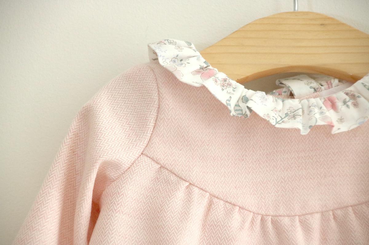 La tela principal que he utilizado para este vestido es una franela de espiga color rosa. Para la confección del detalle de cuello y puños elegí una viyela estampada de flores rosas