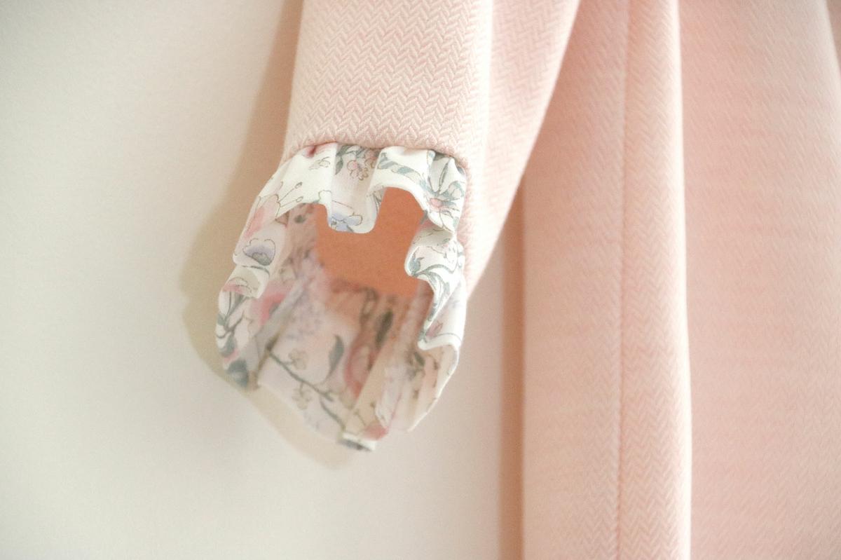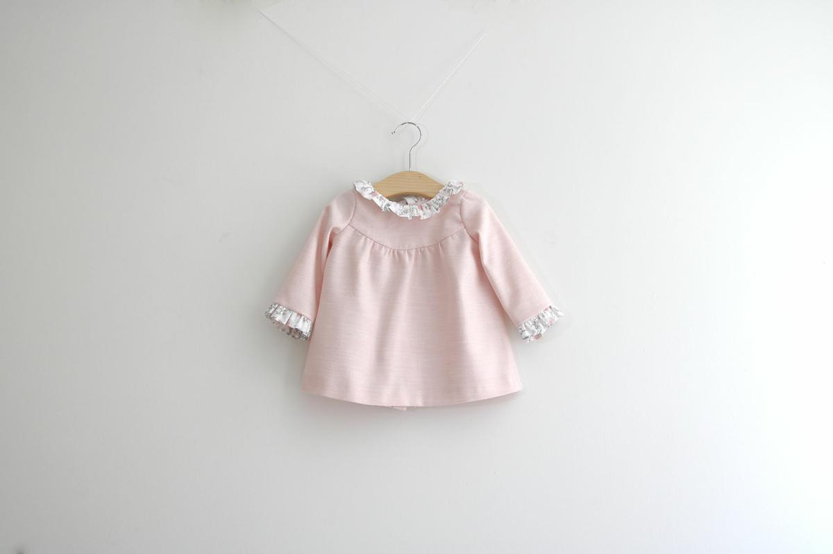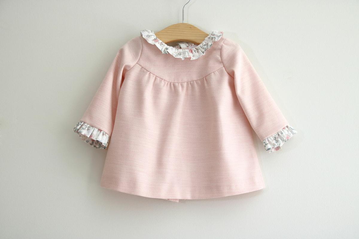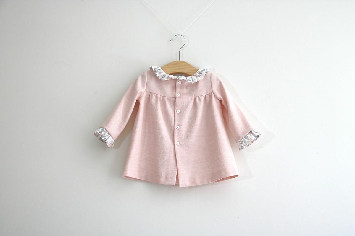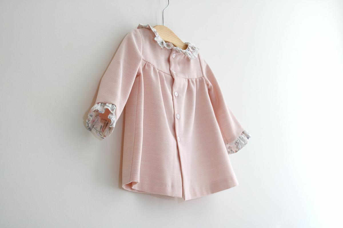 La tela principal que he utilizado para este vestido es una franela de espiga color rosa. Para la confección del detalle de cuello y puños elegí una viyela estampada de flores rosas