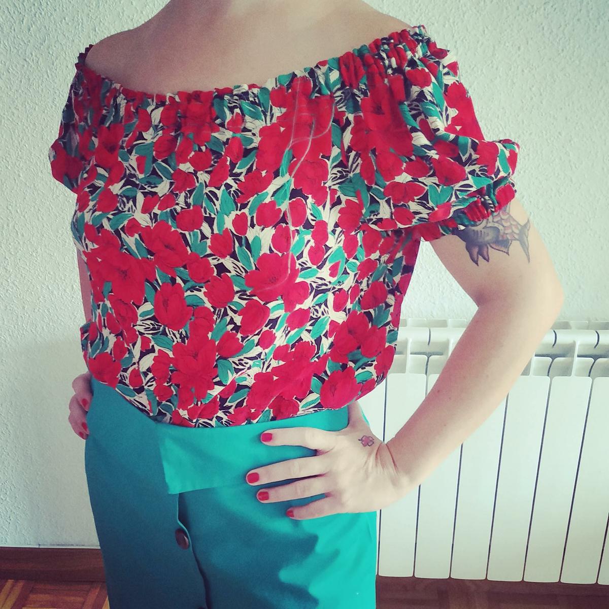 La blusa va ajustada con cinta de goma y lleva manga fruncida también con elástico. Es un patrón muy similar al del tutorial de blusa con volante que subí hace ya unos cuantos años, lo único que no lleva volante y lleva manga.