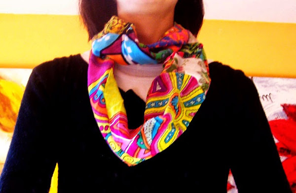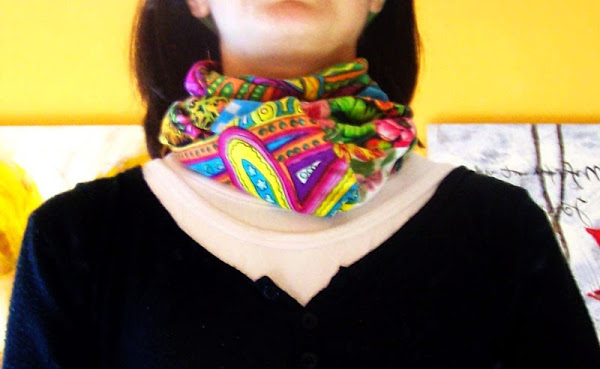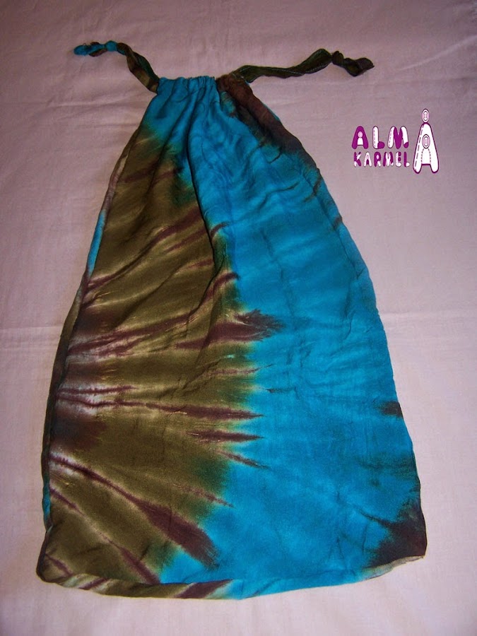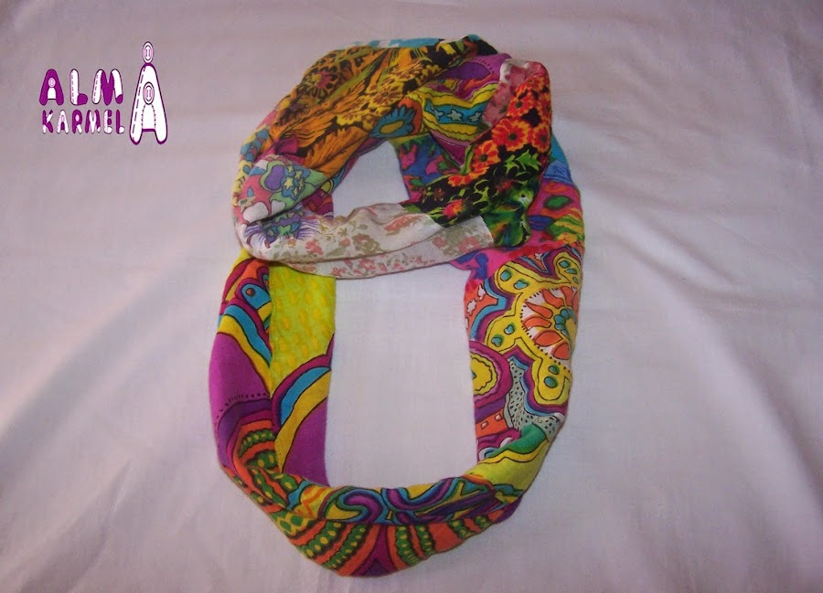 El pasado verano, otra amiga me dió un vestido que ya no le valía, las tengo bien enseñadas... me dan cosas para que las reutilice, jejeje, y pensando en un detallito para Navidad, me acordé del vestido, y lo ví como un pañuelo para la primavera estupendo, ya que tiene un gran colorido.