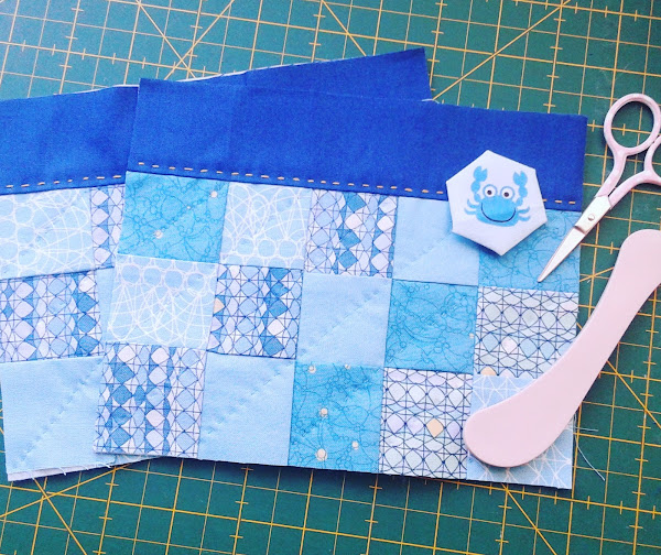 No he conseguido sacar una buena foto de estas telas... son tonos azul turquesa. Estos paneles acolchados son para un extra para el intercambio.