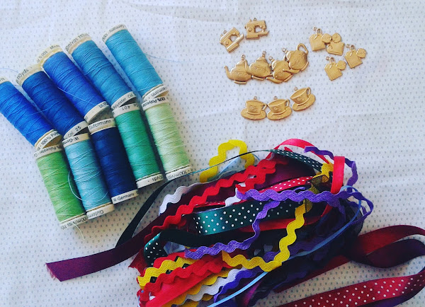 Le compré esas bobinas de hilo Guttermann, unas cuantas cintas de zig zag y lazos, y más charms ;)