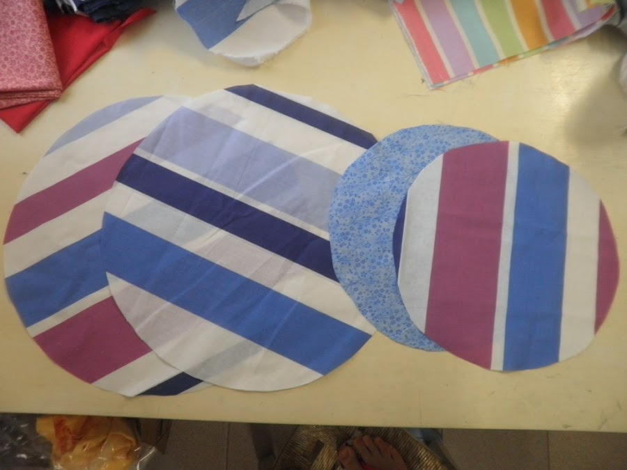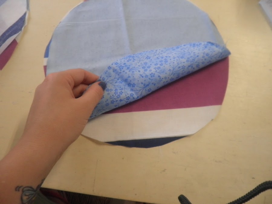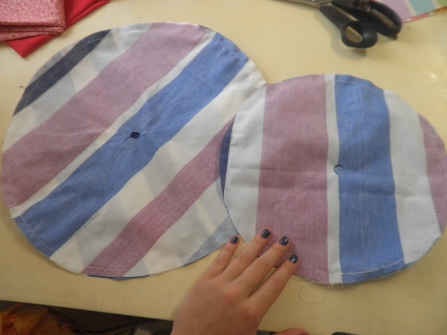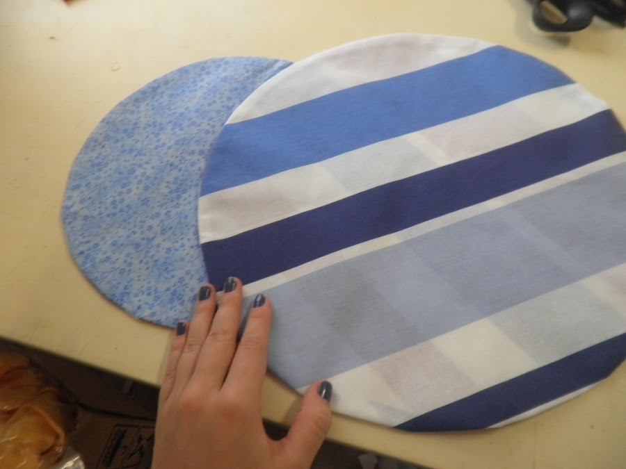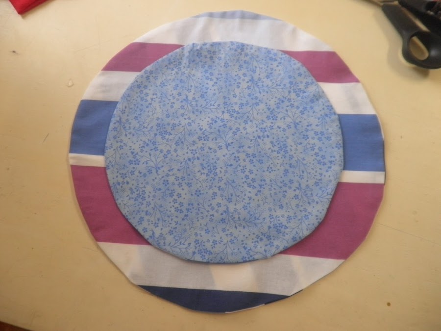 Cortar no tecido dois círculos grandes e dois pequenos ( cada um de um tecido diferente, ou como você preferir)