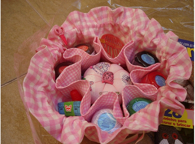 Costure por en cima de las marcas, uniendo los dos circulos y formando los bolsillos para guardar los materiales de costura (puede ser bisutería tambien). Puedes colocar algunos alfileres para ayudar a sostener la tela, mas tengas cuidado para no pasar la maquina por arriba de ellos.)