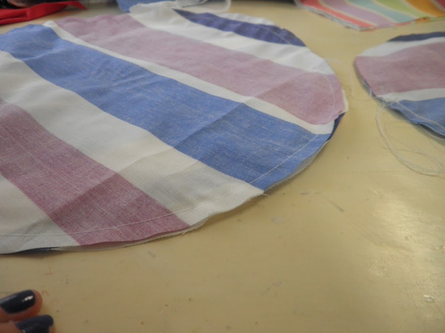 Notem como ela fez a costura unindo os círculos pelo avesso em todo o contorno, sem deixar espaço para virar. Façam isso no círculo grande e no pequeno.