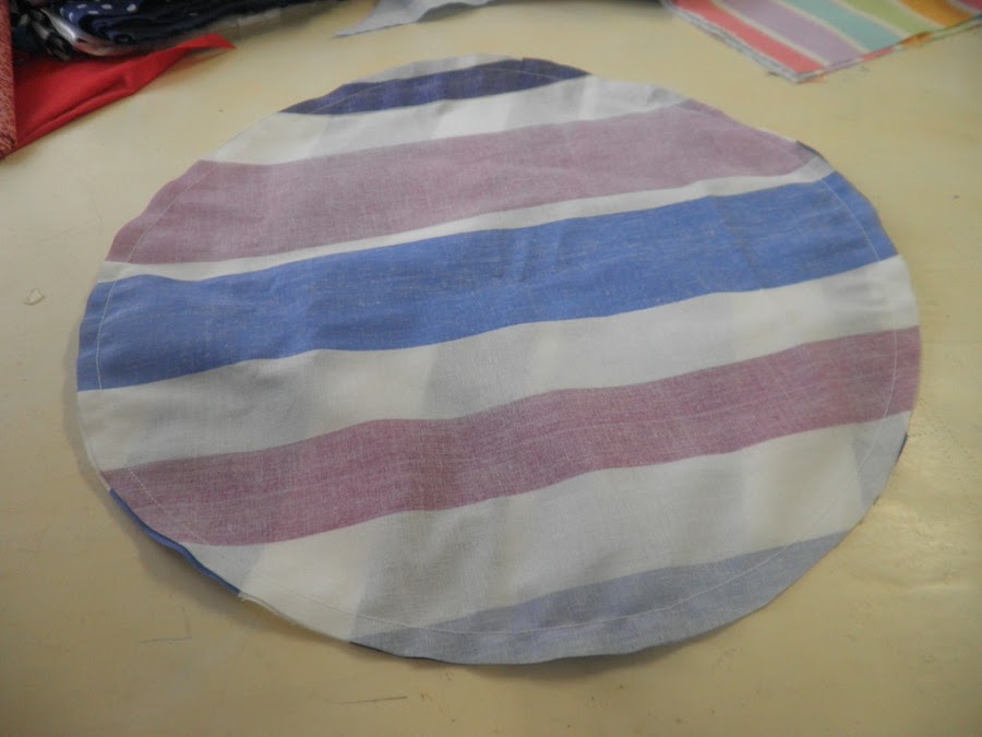sem deixar um pedaço descosturado para virar. Pode costurar em todo o contorno dos círculos, com a margem de um pé de máquina.