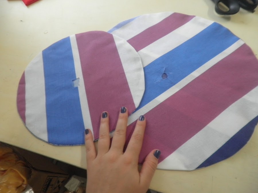 Usando a tesoura, faça um furo bem no centro de cada um dos círculos ( não precisa ser muito grande, deve ser suficiente para virar a peça para o lado direito. CORTE SOMENTE EM UM DOS TECIDOS DE CADA CÍRCULO (o lado que será interno)