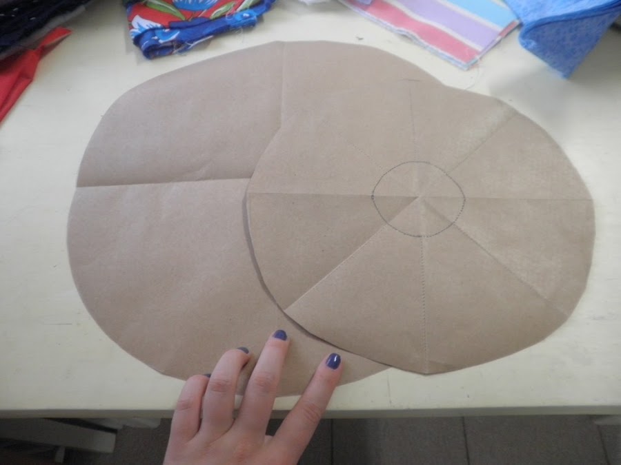 Transfira as marcações do círculo pequeno para o tecido (Pode-se usar giz ou carretilha. Para facilitar a marcação do círculo central, pode recortar ele do molde).