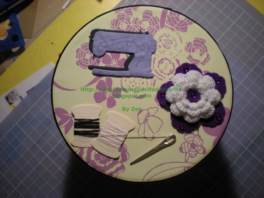 La tapadera con diferentes motivos decorandola. Una flor, elaborada con una flor de croché y otra de fieltro decorado con perlitas moradas de strass. Una máquina de coser de fieltro con su sombra en cartulina negra. Unos carretes de hilo con su aguja ya enebrada y lista para usar En el contorno de la lata se puede ver un maniquí en relieve y otros motivos como dedales y carretes de hilo. Desde esta perspectiva se puede observar el relieve del maniquí. En esta imagen se ve el relieve de otro motivo decorativo en este caso un conjunto de botones.