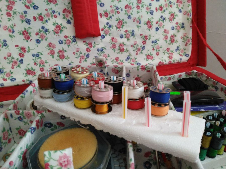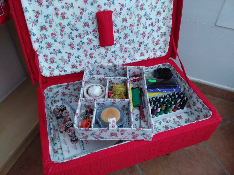 Le añadí un alfiletero, unas cintas laterales para que la tapa se mantenga abierta y una base superior con huecos de diferentes tamaños.