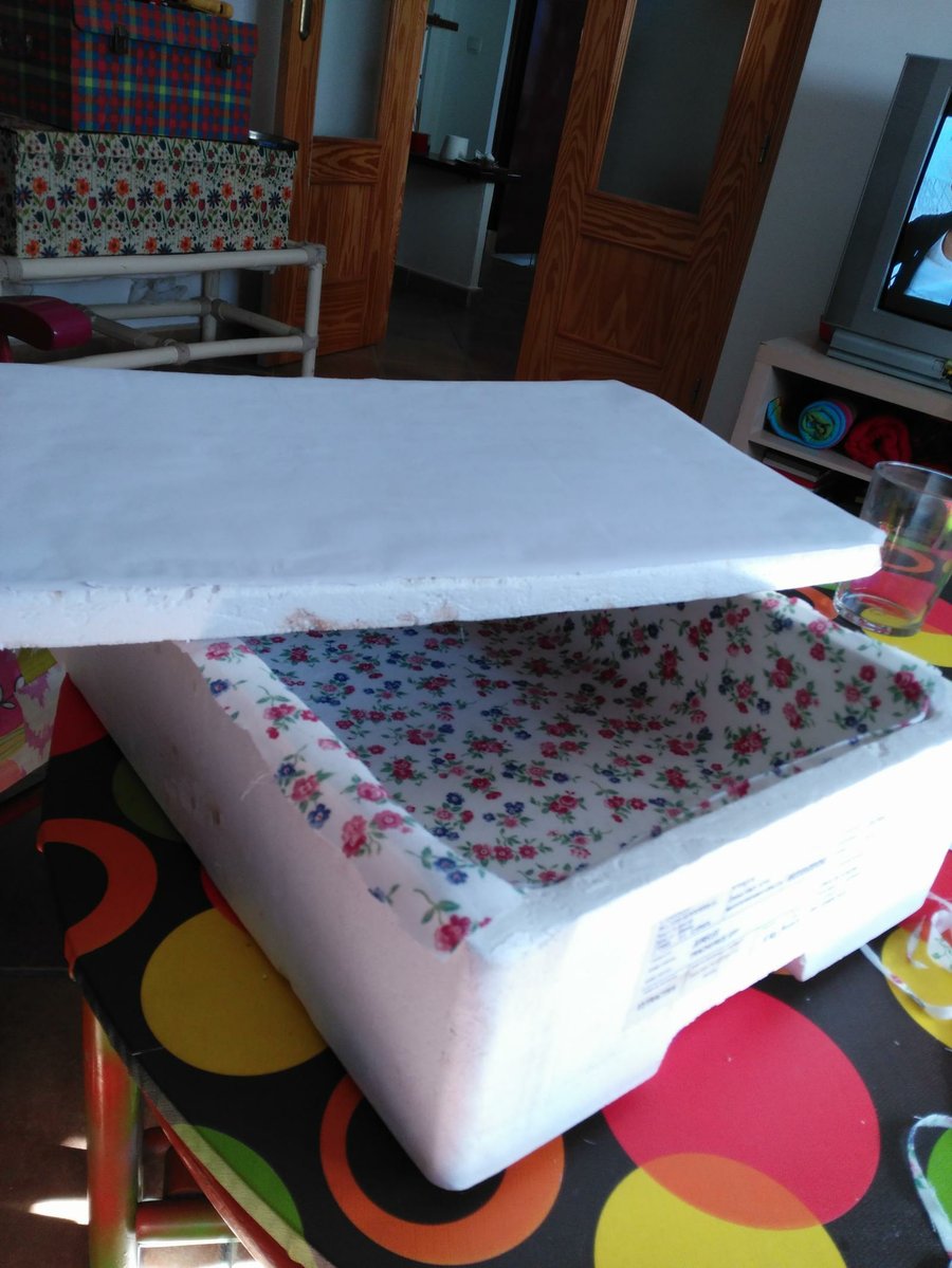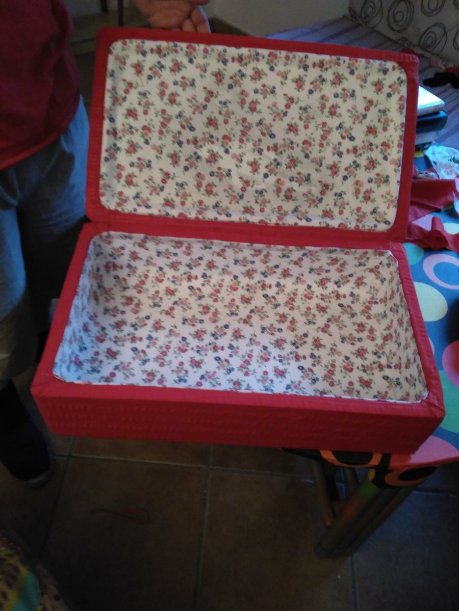 Y por fuera, usando un trozo de la misma tela para agarrar la tapadera y que sirviera de bisagra.