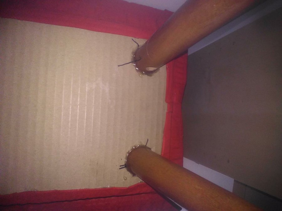 Para las patas usé un cartón de 5 cm. de grosor, al que le hice unos boquetes donde encajarlas, y luego las pegué. Como la caja es de corcho no pesa casi nada.