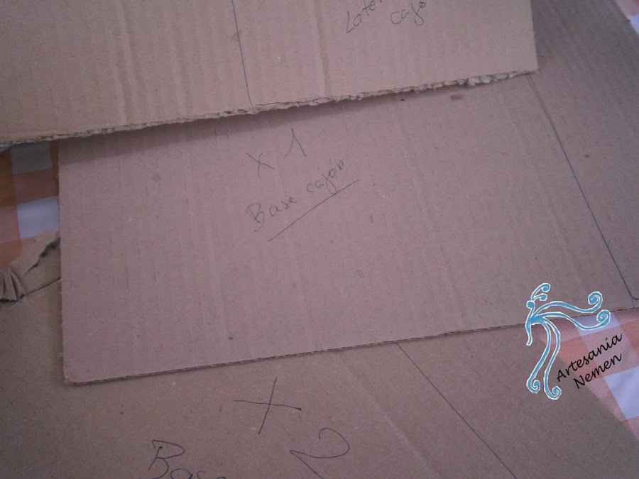 El cajón inferior fue construido con cartón duro, las medidas dependerán del tamaño de las cajas elegidas.