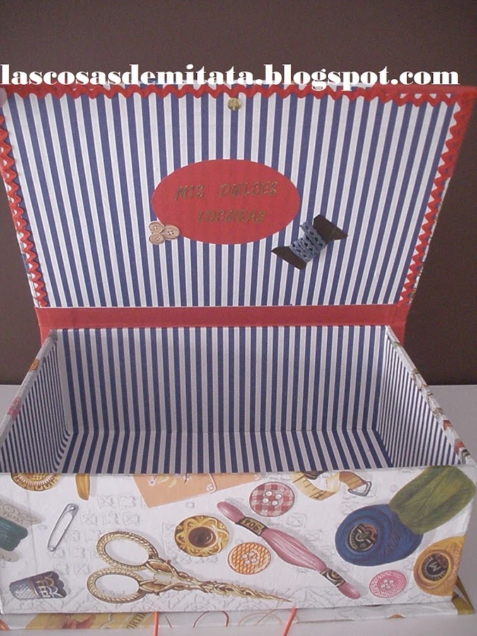 Pues hoy mismo ha salido dirección a Orihuela ( Alicante ) esta caja de Costura, su dueña es Estefanía del blog www.misdulceslocuras.blogspot.es espero que te guste, lo utilices mucho y guardes todas tus cositas, ya me contarás que tal!