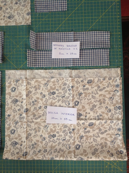 Cortar las telas como se ve en las tres siguientes fotos, ya están incluidos los márgenes de costura.