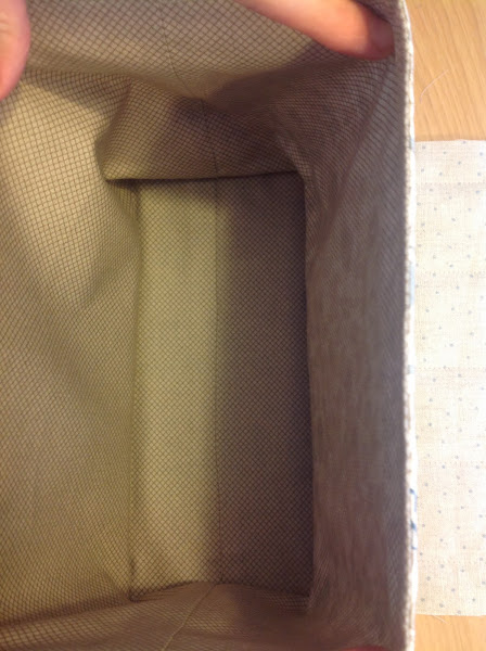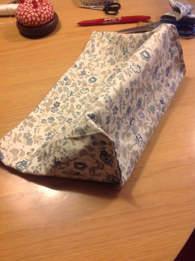 Empezamos haciendo la bolsa del interior: doblar por la mitad la tela de 35cm x 50cm y coser los laterales dejando a 1cm del borde superior un centímetro sin coser (en la foto es el hueco por donde entra las tijeras)