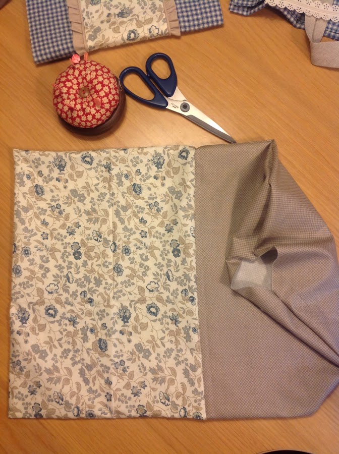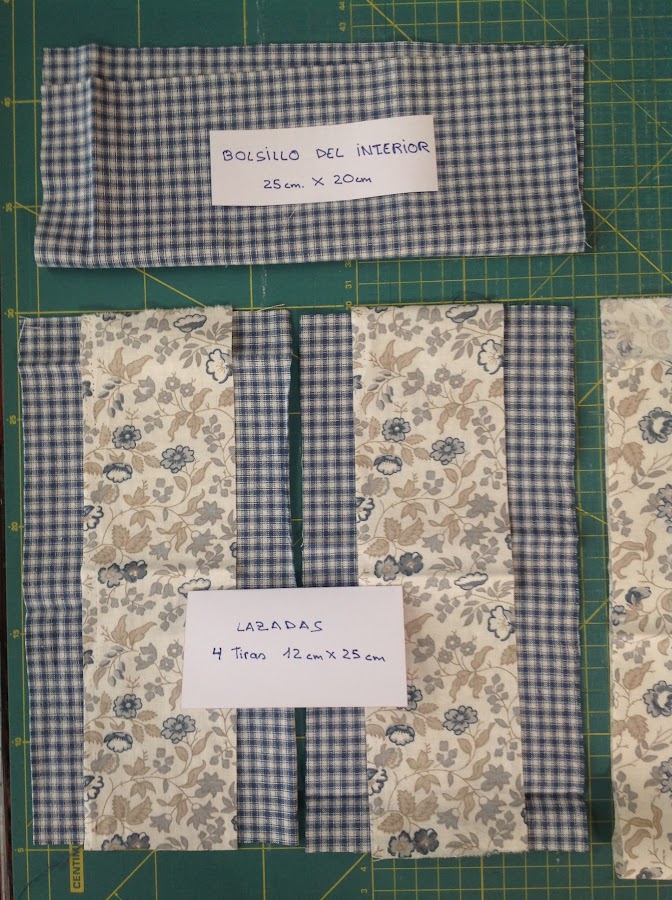 Nota: para las lazadas cortar 4 tiras de 12cm x 25cm que aunque está bien indicado en la foto en este trabajo no me dió la tela y tuve que hacer un apaño (pero no quedó mal):