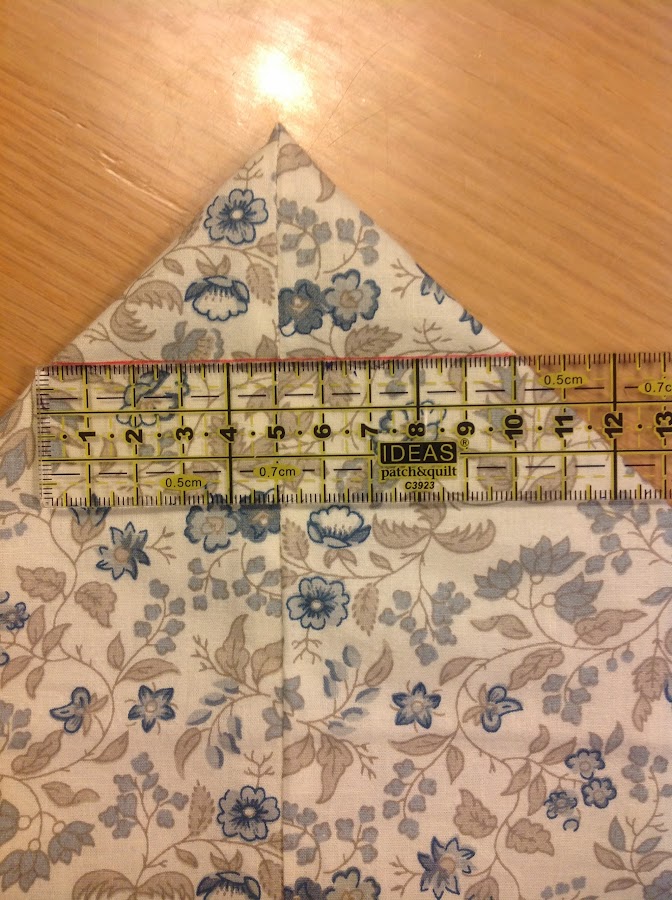 Colocar la bolsa bien alineada para cortar las esquinas. Primero marcamos con un rotulador de los que se borran al planchar, hacer la costura por encima de lo marcado (de 10cm.) y una vez cosido se corta dejando un márgen: