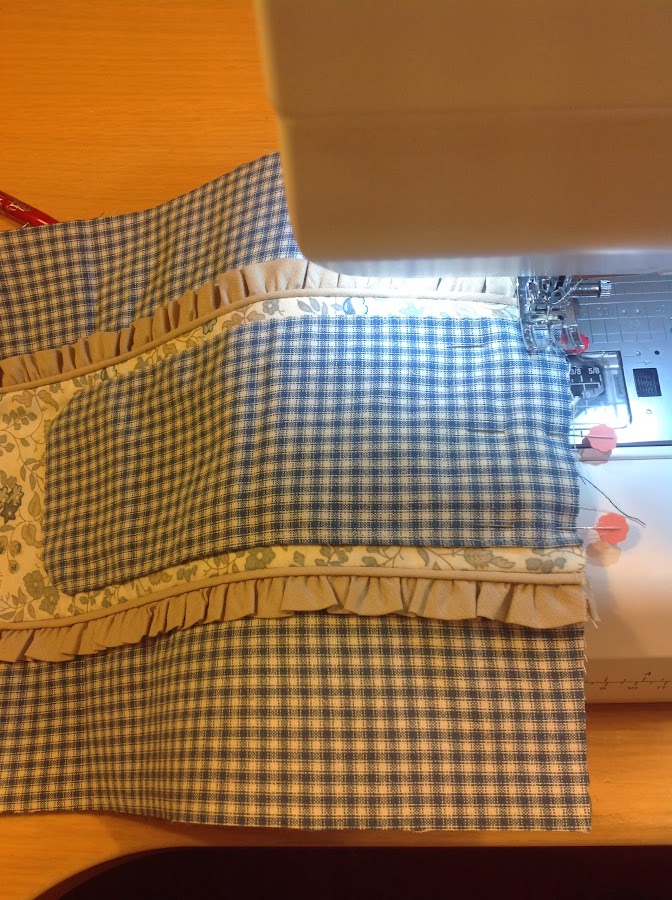 Doblar la tela del bolsillo por la mitad quedando de 25cm x10cm de ancho, cerrar con una costura el lado largo, dar la vuelta y planchar. Coser las cintas decorativas, primero la que va por la parte superior del bolsillo, coser el bolsillo por la parte inferior con la tela acolchada y a continuación tapamos esta costura cosiendo encima la cinta decorativa:
