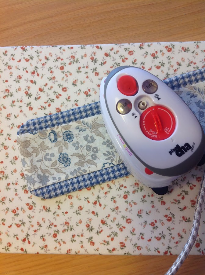 Coger el retal reservado para el interior del estuche (lino con puntos azules) y plancharle una guata termoadhesiva