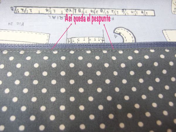 PASO 7: Abrimos la pìeza y por el derecho, hacemos un pespunte en la tela de forro, lo más pegado posible al borde.