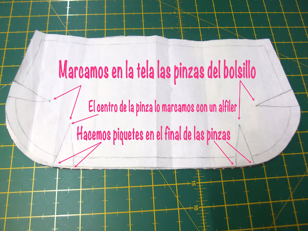 PASO 3: Una vez cortadas todas las piezas, vamos con el bolsillo de abajo. Para ello, lo primero es marcar las pinzas en el revés de la tela principal, haciendo un piquete (un pequeño corte de 0,5 cm) en los extremos de las pinzas y marcando el punto central de cada pinza con un lápiz o con un alfiler. Así, dibujamos la pinza en la tela, marcando una línea desde cada piquete hasta el punto central. Hacemos lo mismo en el revés de la tela del forro.