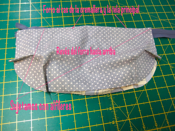 PASO 5: Ahora colocamos el forro y ya podemos sujetar con alfileres nuestra cremallera. Para ello, enfrentando derecho de la tela principal con derecho de forro (es decir, el revés del forro queda hacia arriba), hacemos que el forro quede también al ras de la tela principal y la cremallera. Sujetamos con alfileres o hilvanamos, como queramos.