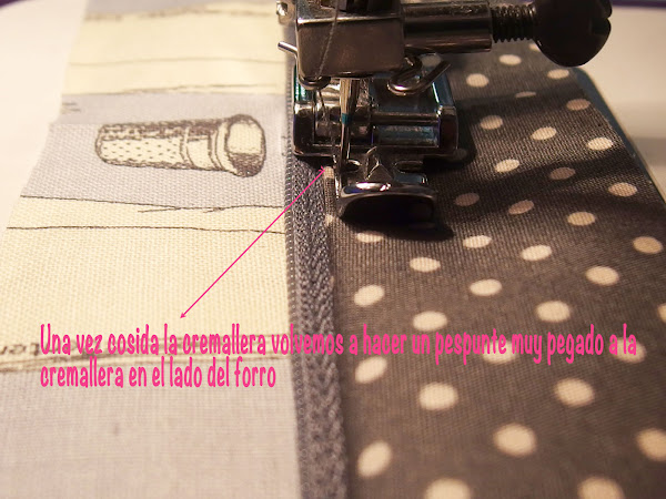 PASO 11: Repetimos los pasos 6 y 7, es decir, con el pie de cremallera normal cosemos la cremallera y hacemos el pespunte en el lado del forro por el derecho muy pegado a los dientes de la cremallera (recordar que ahora estamos cosiendo lo que se corresponde al lado de la pieza de tela de la tira de la cremallera)