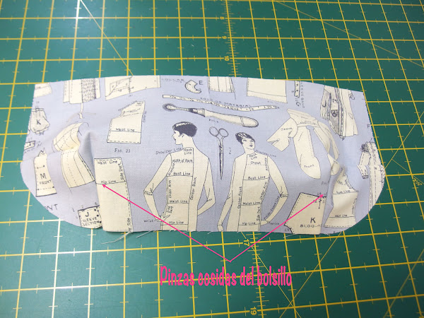 PASO 3: Doblamos la tela por el pico de la pinza, de forma que coincidan los dos pìquetes y que quede el revés hacia nosotras (es decir, derecho de la tela contra derecho) y cosemos desde el piquete que hemos hecho hasta el punto central. Repetimos lo mismo todas las pinzas de las dos piezas de tela, principal y forro.