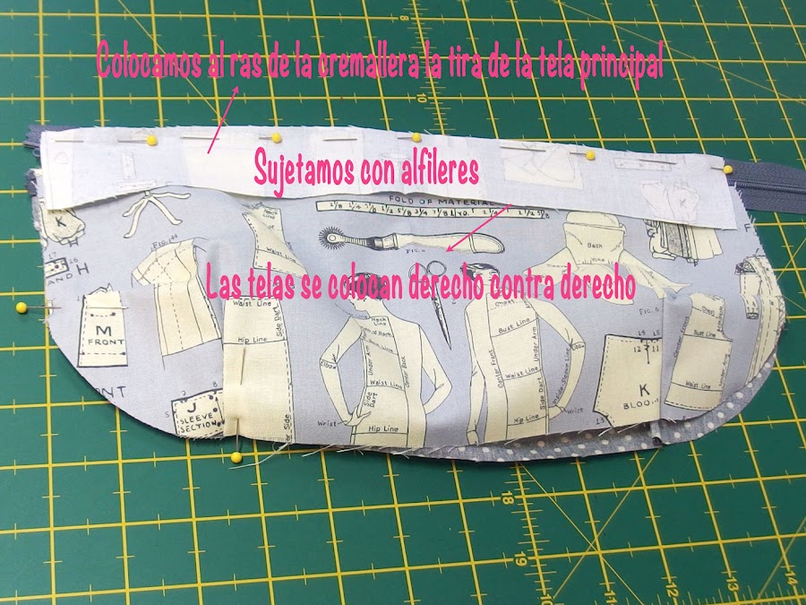 PASO 10: Cogemos la pieza de la tira de la cremallera de la tela principal y la volvemos a poner derecho contra derecho, al ras del final de la cremallera. Sujetamos con alfileres.