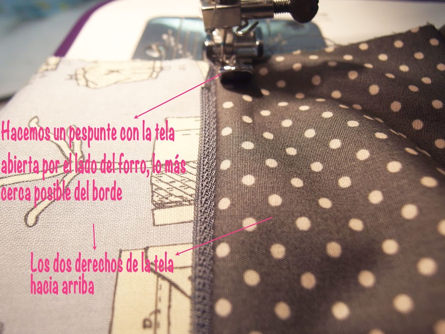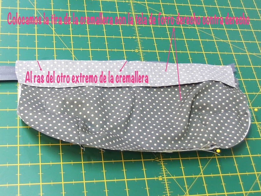 PASO 4: Ahora tenemos que poner la cremallera. Para ello, lo primero es colocar la cremallera como figura en la foto. Es decir, enfrentamos derecho de la cremallera con el derecho de la tela, de manera que la cremallera quede al ras de la tela, es decir, la cremallera queda puesta hacia dentro de la tela.