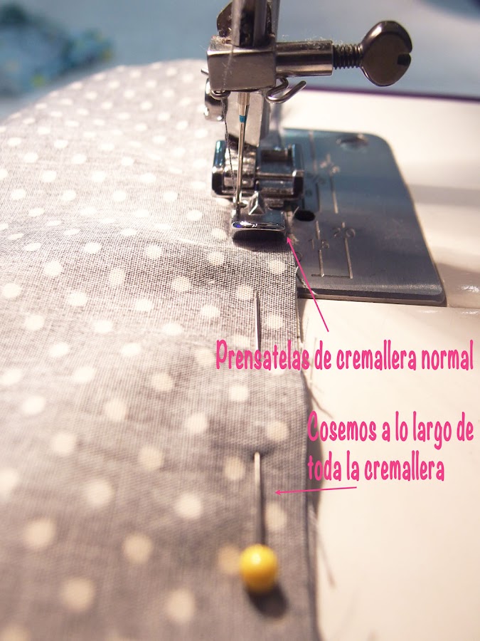 PASO 6: Ponemos nuestro pie de cremallera y cosemos la cremallera por el lado que queda en el exterior de los dientes.