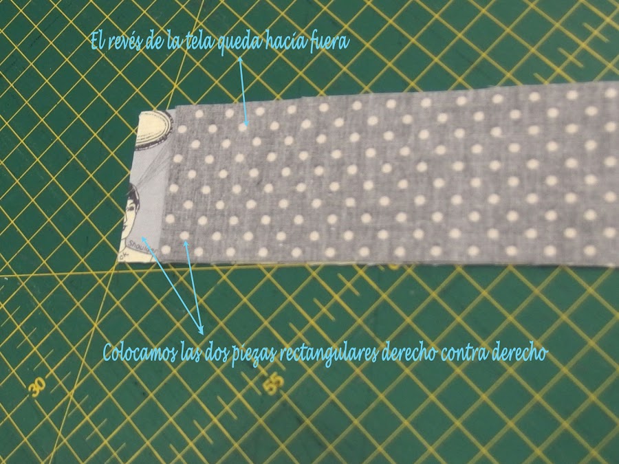PASO 30: Cogemos ahora las piezas alargadas que nos quedan, una con tela principal y otra con tela de forro. Las enfrentamos derecho contra derecho (el revés de la tela queda hacia arriba), y cosemos uno de los extremos.