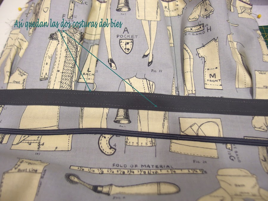 PASO 27: Ahora cosemos el bies de manera que nos quede un pespunte pegado al extremo derecho y otro al extremo izquierdo, tal y como se ve en la segunda foto.