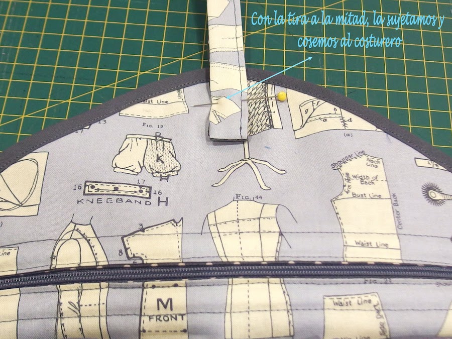 PASO 32: Doblamos la tira a la mitad, la sujetamos con un alfiler en el extremo superior de nuestro costurero y cosemos.