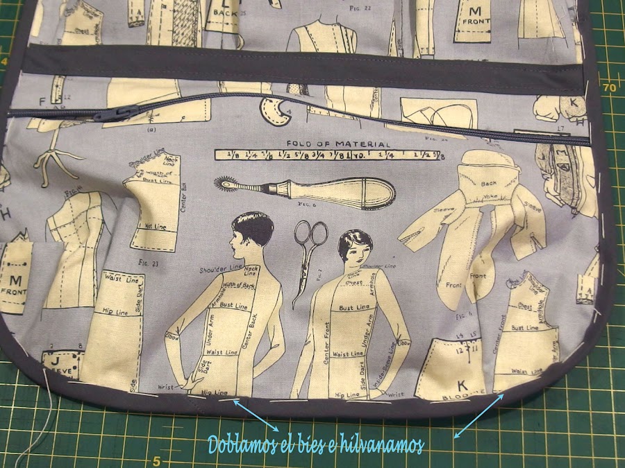 PASO 29: Doblamos el bies hacia dentro, lo hilvanamos y cosemos con la máquina.