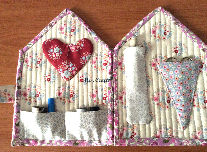 Es el nuevo costurero de Tilda. Es un costurero de viaje, mide 19 cm., con forma de casita, Realizado con t´cnicas de patchqork, como el acolchado de toda la fachada y los distintos motivos aplicados con puntada escondida, además de un letrero en stitchery.
