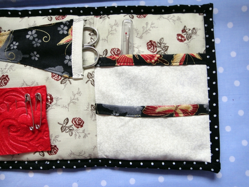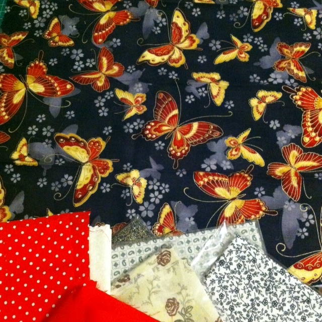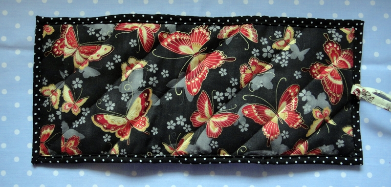 Por mi parte, como siempre, he hecho mis variaciones particulares. Pensé que para llevar en el bolso es mejor una tela oscura y tenía esta tela maravillosa de mariposas a la que le ha llegado su momento.