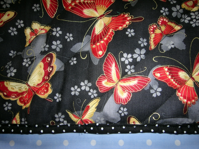 Para poder usarla entera sin estropear las mariposas, no he hecho los cuadros de patchwork del exterior. Tampoco quería machacarla mucho con el acolchado, así que solo he acolchado con unas líneas diagonales en un solo sentido.