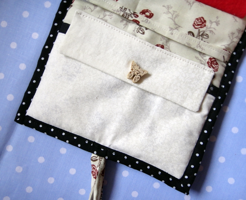 Lleva también un pequeño bolsillo con forma de trapecio, donde caben unas tijeras de bordar (las mías miden 9 cm), y un librito de fieltro para clavar agujas, alfileres, imperdibles... Las tijeras están un poco fuera de su sitio para la foto, pero caben bien dentro del bolsillo.