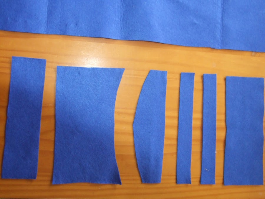 Cortamos 6 piezas o más para hacer los bolsillos, eso depende de como lo quieras, yo lo quiero con varios compartimentos. Cortamos piezas para hacer un sobre, tiras de diferente ancho...