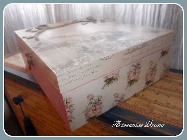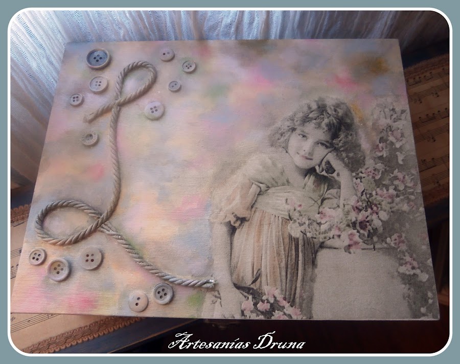 Esta cajita de madera me la consiguió mi querida Mar, y se fue para mi querida Mamen. Está realizada con acrílicas, entelada con doble faz y stencil.También va decorada con tela de arpillería barnizad ...