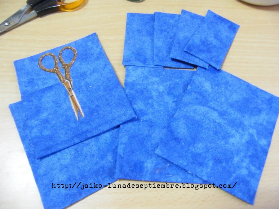 4) recortamos de la misma manera la tela de la parte interior del costurero y forramos las piezas de 9,5 x 8