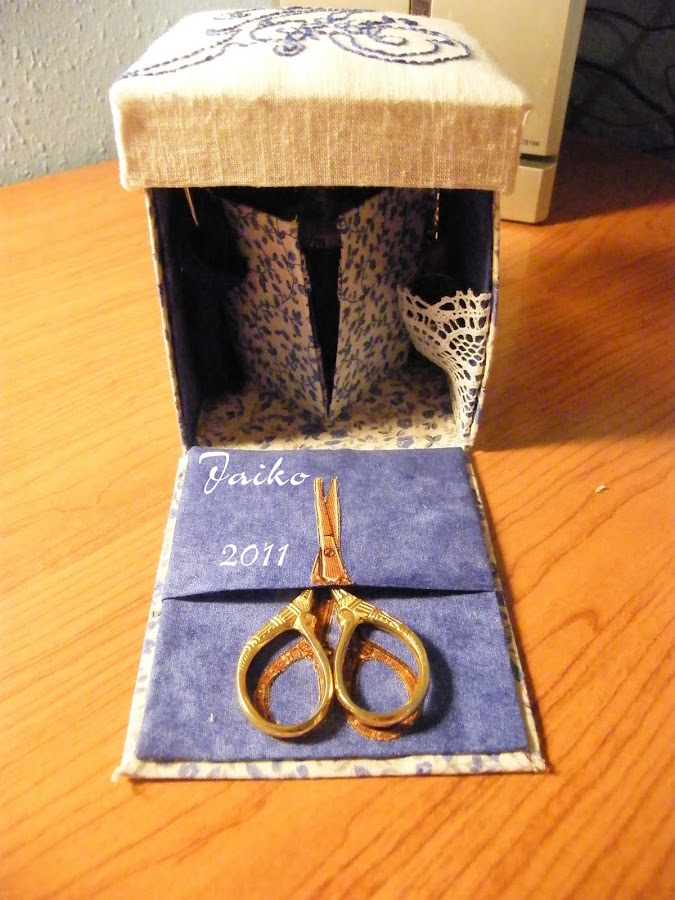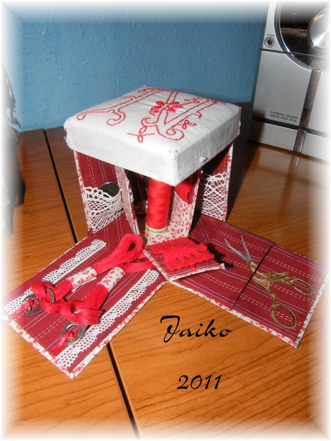A lo que vamos, mientras, he dado rienda suelta al cartón, la cola, diversas telas y demás trastos para hacer un par de costureros victorianos, los vi por la red hace tiempo, busqué la información sobre como hacerlos y... manos a la obra.