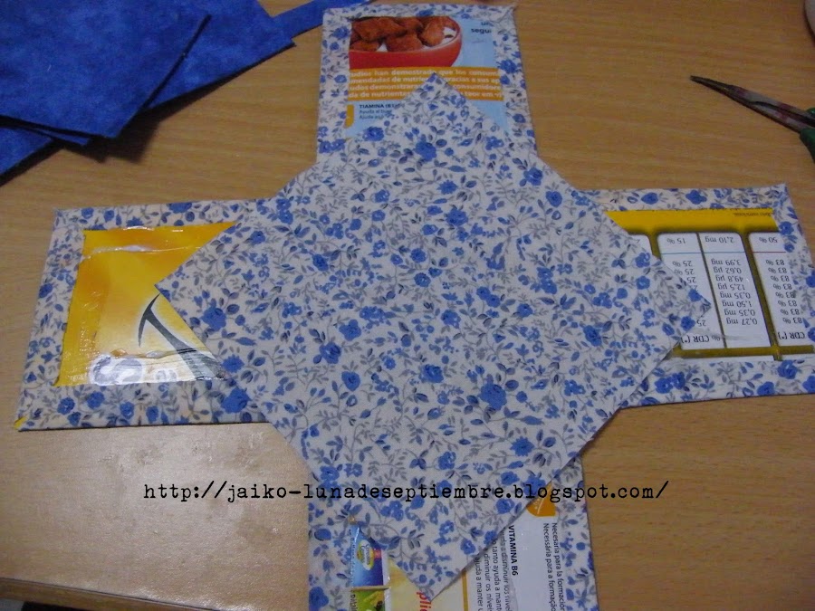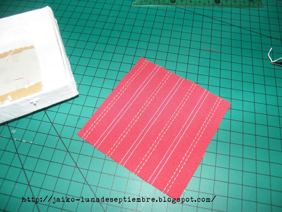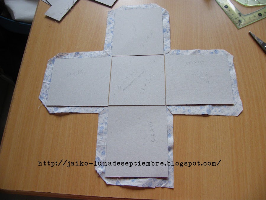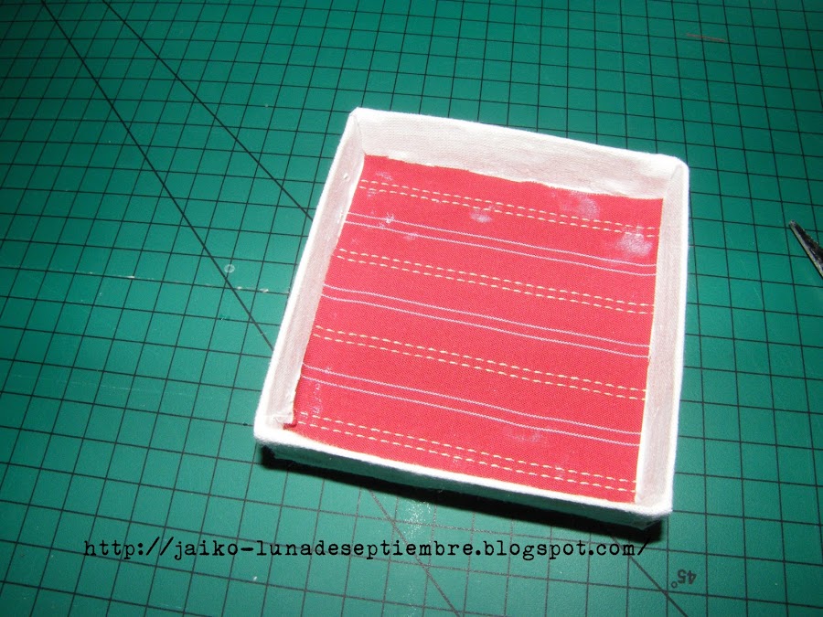 para la parte interior de la tapa, cortamos una pieza de tela de 9 x 9 y la pegamos dentro.